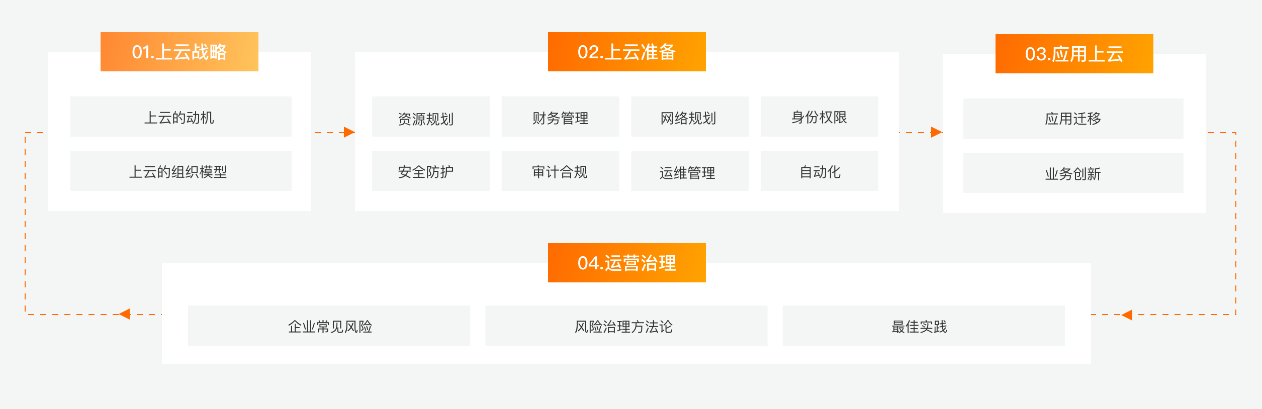 企业在第一个应用上云前,需要有一 整套顶层设计和一系列基础框架,为后续的业务上云扫清障碍。否则,可能会导致后续业务上云面临成本、网络、安全、效率等多方面的问题。